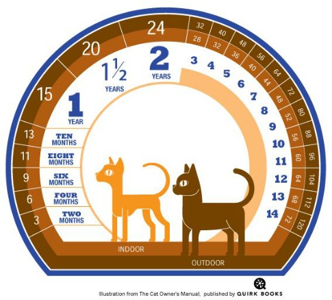 It has been said that cats age the equivalent of seven human years for each year of life, which is a misconception. In reality, cats age more rapidly during the first two years of life. From helpless kittens to teenage in just six months. During this phase they are very energetic and still greatly depend on others. During their first year, cats reach the approximate human age of 15, then 24 at age 2.